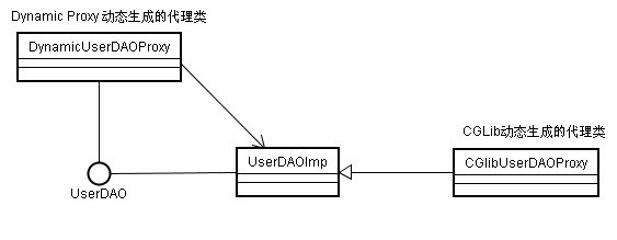 Spring中,基于Dynamic Proxy是面向接口的动态代理实现,其代理对象必须是某个接口的实现。Dynamic Proxy通过在运行期构建一个此接口的动态实现类完成对目标对象的代理(相当于在运行期动态构造一个UserDAOProxy,完成对UserDAOImp的代理任务)。而如果目标代理对象并未实现任何接口,那么Dynamic Proxy就失去了创建动态代理类的基础依据。此时我们需要借助一些其他的机制实现动态代理机制。Spring中,引入了CGLib作为无接口情况下的动态代理实现。