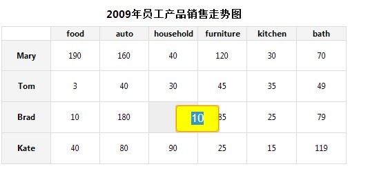 <!DOCTYPE html><head><meta http-equiv="Content-Type" content="text/html; charset=utf-8" /><script type="text/javascript" src="http://code.jquery.com/jquery-1.9.1.js"></script><script type="text/javascript">$(function(){//定义方法$('table td').click(function(){//定义点击事件if(!$(this).is('.input')){//如果当前是.input类$(this).addClass('input').html('<input type="text" value="'+ $(this).text() +'" />').find('input').focus().blur(function(){//当前添加类获得元素新插入一个input通过遍历获得input定义伪类,当失去焦点以后在定义一个方法$(this).parent().removeClass('input').html($(this).val() || 0);//当前查找每个元素,删除掉input类获得input所有元素的值并且和0});}}).hover(function(){//定义伪类$(this).addClass('hover');//当前添加伪类},function(){//定义方法$(this).removeClass('hover');//当鼠标移开后删除伪类});});</script><style type="text/css">/* page styles */body{font-family:"Segoe UI", Frutiger,Tahoma,Helvetica,"Helvetica Neue", Arial, sans-serif;font-size:62.5%;}table{border-collapse:collapse;}td, th{text-align:center;border:1px solid #ddd;padding:2px 5px;}caption{margin:0 0 .5em;font-weight:bold;}/*demo styles*/table{width:500px;height:200px;margin-left:30px;}td, th{font-size:1.2em;padding:2px;width:13%;}th{background-color:#f4f4f4;} caption{font-size:1.5em;}table{float:left;margin:40px 40px 0 0;}.demo{width:500px;margin:0 auto;}/* input */td input{border:1px solid orange;background:yellow;-webkit-border-radius:5px;-moz-border-radius:5px;border-radius:5px;position:absolute;padding:8px 0;text-align:center;width:60px;margin:-17px 0 0 4px;font-size:1.4em;}td.input{ padding:0;position:relative;}td.hover{background:#eee;}</style></head><body><div class="demo"><table><caption>2009年员工产品销售走势图</caption><thead><tr><td></td><th scope="col">food</th><th scope="col">auto</th><th scope="col">household</th><th scope="col">furniture</th><th scope="col">kitchen</th><th scope="col">bath</th></tr></thead><tbody><tr><th scope="row">Mary</th><td>190</td><td>160</td><td>40</td><td>120</td><td>30</td><td>70</td></tr><tr><th scope="row">Tom</th><td>3</td><td>40</td><td>30</td><td>45</td><td>35</td><td>49</td></tr><tr><th scope="row">Brad</th><td>10</td><td>180</td><td>10</td><td>85</td><td>25</td><td>79</td></tr><tr><th scope="row">Kate</th><td>40</td><td>80</td><td>90</td><td>25</td><td>15</td><td>119</td></tr></tbody></table></div></body></html>