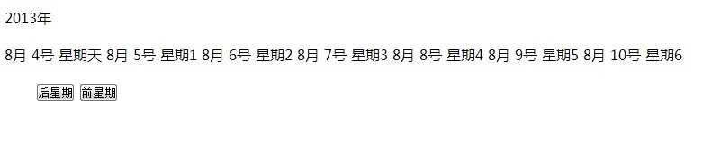 <!DOCTYPE html><head><meta charset="UTF-8"><style type="text/css">* { margin:0;padding:0px;} body{font-family:Microsoft YaHei;}.date p{float:left;margin-top: 20px;margin-left:5px;}.button{float:left;margin-top: 20px;margin-left:40px;width:100%;}#age{float:left;width:100%;}</style><script language="javascript" type="text/javascript" src="http://code.jquery.com/jquery-1.9.1.js"></script><script language="javascript" type="text/javascript">$(document).ready(function(){var time = new Date(); //定义总的时间var age = '<p id="age">' + time.getFullYear() + '年' + '</p>';//定义年份$('#date').append(age);//直接写入年份for( var i=0; i<7; i++)//循环7次{var month ='<p id="month">' + [ time.getMonth() + 1] + '月' + '</p>' ;//获得月份占时不会出现月份的变动var sky = '<p id="sky">' + [time.getDate() + i] + '号' + '</p>';//获得天数 这个就在一直用i来循环var week = '<p id="week">'+ '星期' + [time.getDay() + i] + '</p>';//通过直接调用方法好获得准确的星期几if(time.getDay() + i == 0 && 7){week = '<p id="week">'+ '星期天' + '</p>';}//在这里星期天是0来代表的时候需要跟换一下把0换成或者是7星期天$("#add-time").click(function(){//var sky = '<p id="sky">' + [time.getDate() + i + 1] + '号' + '</p>';});$('#date').append(month);$('#date').append(sky);$('#date').append(week);//写入div里}});</script></head><body><div id="date" type="button" value="后星期"/><input id="reduce-time" type="button" value="前星期"/></div></body></html>