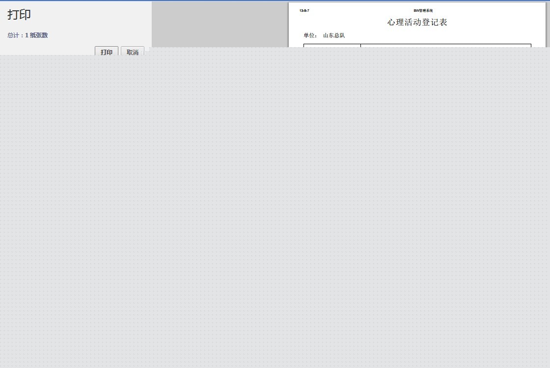 一、引用代码:也就是在页面head内,加入一个object对象元素,元素的classid属性值是固定的,一个很长的唯一识别字符串,而id属性值是可以自定义的,大家习惯地把这个值设为大写字母LODOP,后面在使用控件功能时用它来代表控件。<script src="js/LodopFuncs.js" type="text/javascript"></script> <object id="LODOP_OB" classid="clsid:2105C259-1E0C-4534-8141-A753534CB4CA" width="0" height="0"> <embed id="LODOP_EM" type="application/x-print-lodop" width="0" height="0" pluginspage="install_lodop32.exe"></embed> </object>二、 做个链接:<a href="javascript:myPreview()"><b>打印预览</b></a>三、JS代码<script language="javascript" type="text/javascript"> var LODOP; //声明为全局变量 function myPreview() { CreatePrintPage(); LODOP.PREVIEW(); //打印预览 }; function CreatePrintPage() { LODOP = getLodop(document.getElementById('LODOP_OB'), document.getElementById('LODOP_EM')); var strBodyStyle = "<style>" + document.getElementById("yangshi").innerHTML + "</style>"; //这里的“yangshi"是样式表的ID,如 <style type="text/css" id="yangshi"></style> var strFormHtml = strBodyStyle + "<body>" + document.getElementById("divdiv1").innerHTML + "</body>";//这里的”divdiv1“是标签的名称。 LODOP.PRINT_INIT("高青公路养护"); LODOP.SET_PRINT_PAGESIZE(1, 0, 0, "A4") ; //A4纸张纵向打印 LODOP.SET_PRINT_STYLE("FontSize", 9); LODOP.ADD_PRINT_HTM("0%", "0%", "100%", "100%", strFormHtml);//四个数值分别表示Top,Left,Width,Height };</script>注意上面同一种颜色的字符要统一,否则后面就无法调用前面声明的变量等。<script language="javascript">function showH(){var strr=$("#checked").val();var checkbox=document.getElementsByName("aids");var arr=strr.split(",");for(var i=0;i<arr.length;i++){for(var j=0;j<checkbox.length;j++){if(arr[i].trim()==checkbox[j].value){checkbox[j].checked=true;}}}}function Printpart(id_str)//id-str 内容中的id { var el = document.getElementById(id_str); var iframe = document.createElement('IFRAME'); var doc = null; iframe.setAttribute('style', 'position:absolute;width:0px;height:0px;left:-500px;top:-500px;'); document.body.appendChild(iframe); doc = iframe.contentWindow.document; doc.write('<div>' + el.innerHTML + '</div>'); doc.close(); iframe.contentWindow.focus(); iframe.contentWindow.print(); if (navigator.userAgent.indexOf("MSIE") > 0) { document.body.removeChild(iframe); } return false; }</script><link rel="Stylesheet" href="<c:url value='/css/nav.css" type="text/css'/>" /></head><body onload="showH()"><%@ include file="/bd/xlgzgl/xljkjyprint.jsp"%><s:form id="editForm" action="xljkjyAction_search" enctype="multipart/form-data" namespace='/bd'><s:hidden name="search" value="1"/><s:hidden name="xljkjy.aid"/><s:hidden name="xljkjy.cjsj"/><s:hidden name="xljkjy.cjzid"/><s:hidden name="xljkjy.cjzssbmid"/><div width="16" height="13" hspace="6" align="absmiddle" />心理健康教育 <s:if test="modify&&(xljkjy.aid!=null)"><div method="save" onclick="return confirm('确认提交?')" cssid="save" method="save" onclick="return confirmSave()" cssmethod="exportYffzjyExcel" cssvalue="打印" cssonclick="return Printpart('form1')"/></div></s:if><div css/></div><DIV class=topic_nav_block_wrapper><UL class=topic_nav_block id="myul1"><LI><A href="#">心理健康教育</A></LI></UL><DIV class=clear></DIV></DIV><div id="mainTables1"><div style="display:block;margin-left: 0px"><table width="100%" border="0" cellpadding="0" cellspacing="1" bgcolor="#d9d6d6" width="15%">活动名称</td><td width="35%" ><s:textfield name="xljkjy.hdmc" id="hdmc"/></td> <td width="15%">活动时间</td> <td width="35%"><s:textfield name="xljkjy.hdsj" onclick="SelectDate(this,'yyyy-MM-dd')" readonly="true" size="20" id="hdsj"> <s:param name="value"><s:date name="xljkjy.hdsj" format="yyyy-MM-dd"/></s:param> </s:textfield></td></tr><tr> <td width="15%">活动地点</td> <td width="35%"><s:textfield name="xljkjy.hddd" id="hddd"/></td> <td width="15%">组织者</td> <td width="35%"><s:textfield name="xljkjy.zzr" id="zzr"/></td> </tr> <tr> <td width="15%">授课人</td> <td width="35%"><s:textfield name="xljkjy.skr" id="skr"/></td> <td width="15%">参加人员及数量</td> <td width="35%"><s:textfield name="xljkjy.cjrsl" id="cjrsl"/></td></tr><tr><%-- <td width="15%">参加人</td> <td width="35%" ><s:textarea name="xljkjy.cjr" cssStyle="width:99%" id="cjr"/></td> --%><td width="15%">活动形式</td><td width="35%" colspan="3"><s:if test="hdxs==null"><s:textfield name="xljkjy.hdxs" id="hdxs" readonly="true"/></s:if><s:else><s:textfield name="xljkjy.hdxs" id="hdxs" value="%{hdxs}" readonly="true"/></s:else></td> </tr> <tr> <td width="15%" style="height:50px;">活动内容</td> <td colspan="3" style="height:60px;"><s:textarea name="xljkjy.hdnr" cssStyle="height:100%;width:100%" id="hdnr"/></td></tr></table></div><%@ include file="/commons/uploadfile.jsp"%><s:actionmessage/><s:actionerror/></div></div></s:form></body><%@ page language="java" import="java.util.*" pageEncoding="UTF-8"%><!DOCTYPE HTML PUBLIC "-//W3C//DTD HTML 4.01 Transitional//EN"><html> <head> <script type="text/javascript" src="../../js/jquery.js"></script><script type="text/javascript">$(document).ready(function(){var hkey_key; var hkey_root="HKEY_CURRENT_USER"; var hkey_path="\\Software\\Microsoft\\Internet Explorer\\PageSetup\";var RegWsh = new ActiveXObject("WScript.Shell"); hkey_key="header"; RegWsh.RegWrite(hkey_root+hkey_path+hkey_key,""); hkey_key="footer"; RegWsh.RegWrite(hkey_root+hkey_path+hkey_key,"");})</script> </head> <body> <div style="display:none"> <form id="form1"> <div align="center" style="font-size: 12px"><h1>心理活动登记表</h1></div><p>单位: <s:property value="#session.loginUser.sysUsers.jgqc"/> </p><table width="100%" height="816" border="1" cellpadding="0" cellspacing="0" bordercolor="#000000" style="border-collapse:collapse;"> <tr> <td height="41" width="25%"><div align="center">活动名称</div