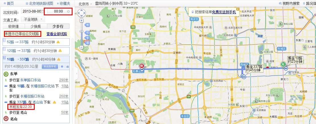 (1)需要将乘坐公交和打车路线结合起来,还拿看电影那天的情景,搜索后在23:50时如果我搜索从东单到八宝山坐10路公交的话,我必须先坐10路到“长椿街路口北”下车,才能在做337路回家,可能只有傻子才明知道赶不上337路还要做到长椿街,而是应该明确告知用户后面的路程应该打车,甚至应该在西单下车就可以了,而不是让用户偏离最近路线。