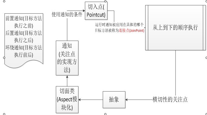 横切面的关注点:就是我们按顺序执行程序时、不知道插入新的程序进来;也就是说只有当程序运行时才能表现出来。当我们碰到这个横切关注点后、需要对此问题进行分析;分析以后对问题进行模块化、模块化一般都会形成一个类,这个类一般就叫做切面类;这个切面类中要做的一般就是对横切性问题给出具体的实现也就是关注点的实现方法、这个方法在AOP中叫做通知;通知可以分为三类:前置通知:就是目标方法执行之前