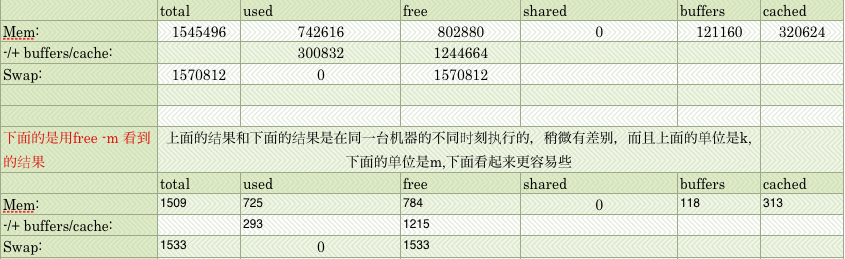 第二行(mem)的used/free与第三行(-/+ buffers/cache) used/free的区别。