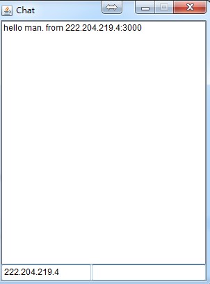 package com.chat.app;import java.awt.BorderLayout;import java.awt.Frame;import java.awt.List;import java.awt.Panel;import java.awt.TextField;import java.awt.event.ActionEvent;import java.awt.event.ActionListener;import java.awt.event.WindowAdapter;import java.awt.event.WindowEvent;import java.io.IOException;import java.net.DatagramPacket;import java.net.DatagramSocket;import java.net.InetAddress;import java.net.SocketException;import java.net.UnknownHostException;public class Chat extends Frame{/** * */private static final long serialVersionUID = 1L;List list = new List(6);//定义列表框,最多显示6行TextField tfIP = new TextField(15);TextField tfData = new TextField(20);DatagramSocket ds = null;public Chat(){try {ds = new DatagramSocket(3000);//设置自己接收数据的端口号为3000} catch (SocketException e1) {e1.printStackTrace();}this.add(list,"Center");Panel p = new Panel();this.add(p,"South");p.setLayout(new BorderLayout());p.add(tfIP,"West");p.add(tfData,"East");/** * 接收数据处理代码 */new Thread(new Runnable(){public void run(){byte[] buf = new byte[1024];DatagramPacket dp = new DatagramPacket(buf,buf.length);while(true){try {ds.receive(dp);} catch (IOException e) {if(!ds.isClosed()){//只有当程序没有被关闭时,发生异常才会抛出异常e.printStackTrace();}}list.add(new String(buf,0,dp.getLength())+" from "+dp.getAddress().getHostAddress()+":"+dp.getPort(),0);}}}).start();/** * 网络消息发送处理代码 */tfData.addActionListener(new ActionListener() {public void actionPerformed(ActionEvent e) {//取出消息文本框中的数据和ip文本框中的IP地址byte[] buf = tfData.getText().getBytes();try {DatagramPacket dp = new DatagramPacket(buf, buf.length,InetAddress.getByName(tfIP.getText()),3000);//这里设置接收消息的端口号为3000ds.send(dp);//如果将ds.send(dp);语句放到try语句块外面,则访问不到dp了,因为dp的有效范围为try语句块内} catch (UnknownHostException e1) {e1.printStackTrace();} catch (IOException e1) {e1.printStackTrace();}tfData.setText("");}});addWindowListener(new WindowAdapter() {public void windowClosing(WindowEvent e){ds.close();dispose();System.exit(0);}});}public static void main(String[] args) {System.out.println("Starting chat...");Chat mainFrame = new Chat();mainFrame.setSize(300, 400);mainFrame.setTitle("Chat");mainFrame.setVisible(true);mainFrame.setResizable(false);}}