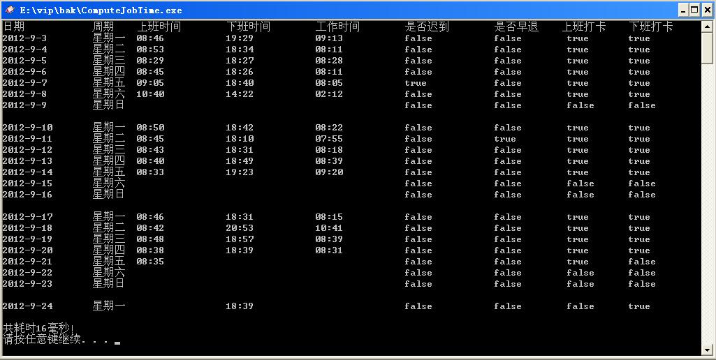 最近写的计算上班时间的程序,检查是否迟到早退,有没有打卡,防止被扣工资
