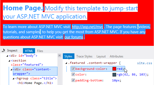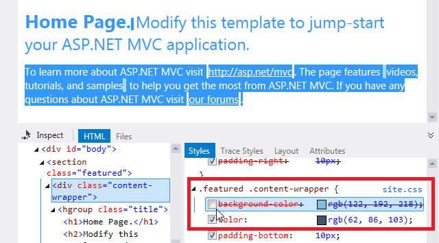 风格窗口显示所有的此元素的 CSS 规则。向下滚动找到.featured.content-包装类选择器。单击".featured.content-包装"。页检查器将打开定义这种风格 (Site.css),并突出显示相应的 CSS 样式的 CSS 文件。