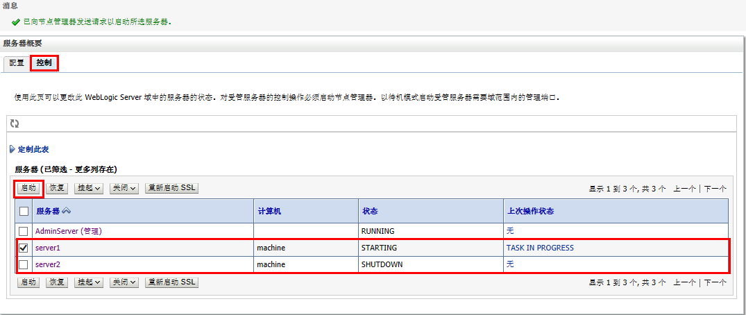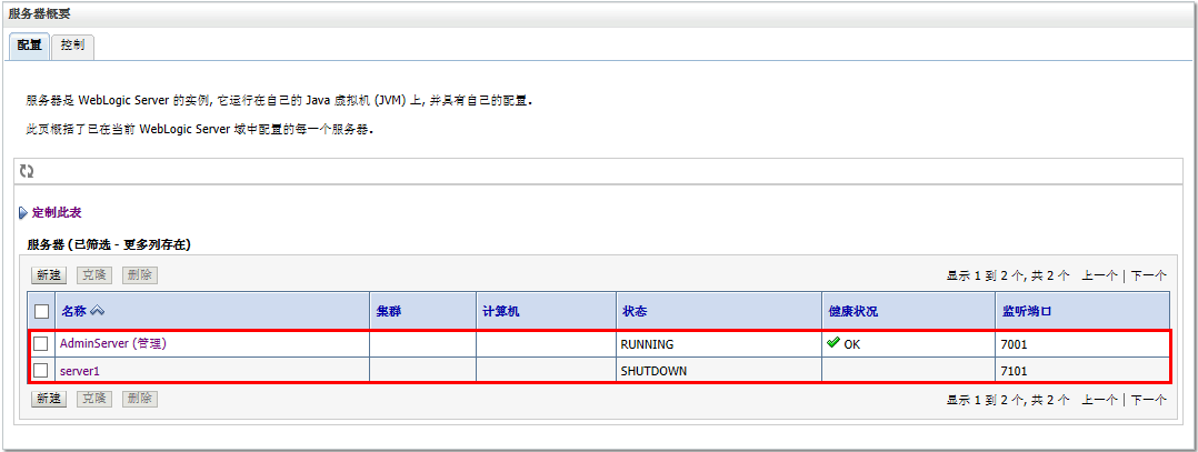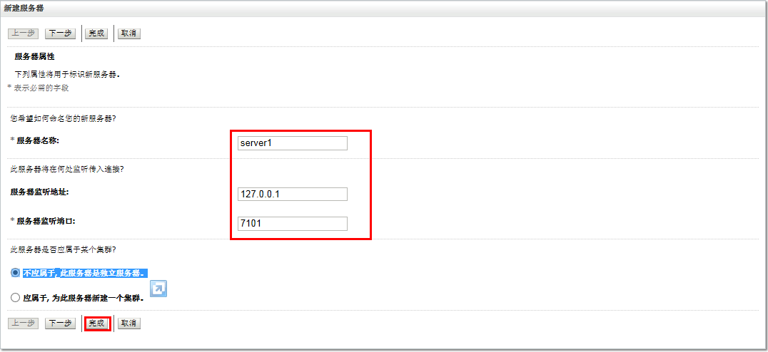 输入规划的服务器名称server1,地址、监听端口,点击“完成”返回服务器列表页面,如下图所示: