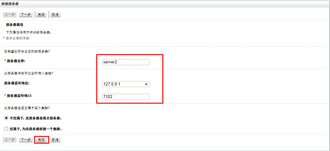 输入规划的服务器名称server2,地址、监听端口,点击“完成”返回服务器列表页面,如下图所示: