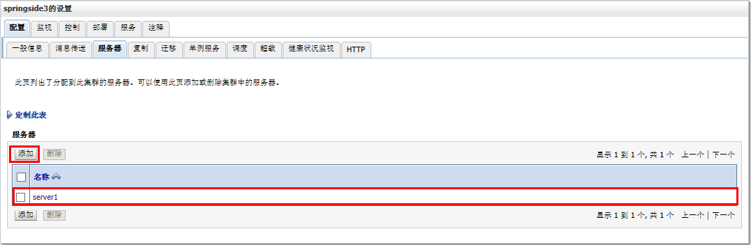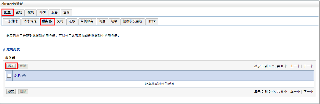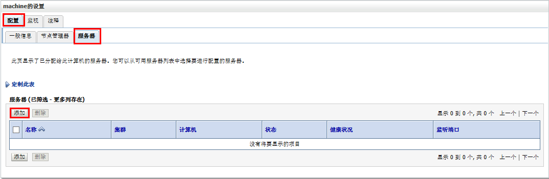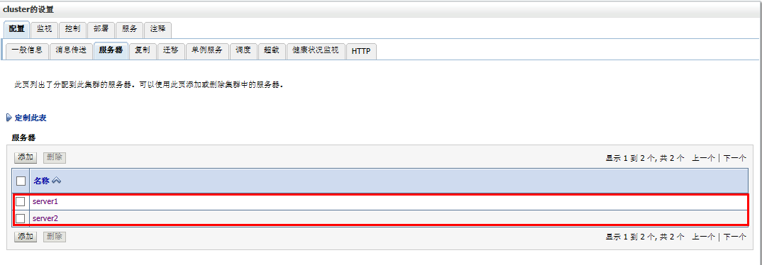 点击列表中的cluster链接,打开集群配置界面,选择“配置”-》服务器,如图所示: