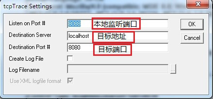 我们实例中的Web Service运行于8080端口,可以让TcpTrace在8088端口上监听,并将8088端口监听的报文转发到8080端口上,通过这样的设置后,TcpTrace就可以截获请求和响应的SOAP报文。