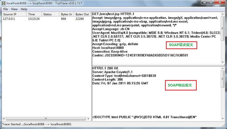 3.重新运行客户端程序,用户将可以在TcpTrace中看到SOAP的请求和响应报文