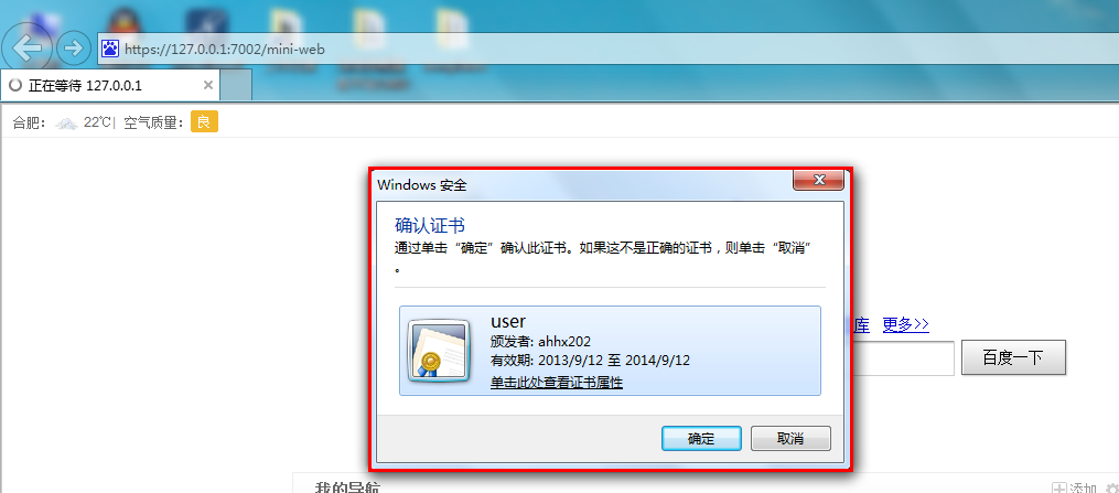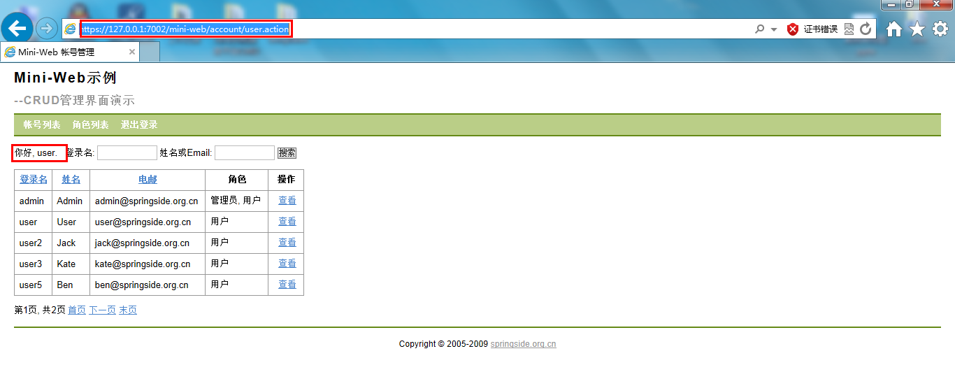 <!-- http安全配置 --><s:http auto-config="true" use-expressions="true"><s:intercept-url pattern="/css/**" filters="none" /><s:intercept-url pattern="/img/**" filters="none" /><s:intercept-url pattern="/js/**" filters="none" /><s:intercept-url pattern="/account/user!save*" access="hasAnyRole('ROLE_修改用户')" /><s:intercept-url pattern="/account/user!delete*" access="hasAnyRole('ROLE_修改用户')" /><s:intercept-url pattern="/account/user*" access="hasAnyRole('ROLE_浏览用户')" /><s:intercept-url pattern="/account/role!save*" access="hasAnyRole('ROLE_修改角色')" /><s:intercept-url pattern="/account/role!delete*" access="hasAnyRole('ROLE_修改角色')" /><s:intercept-url pattern="/account/role*" access="hasAnyRole('ROLE_浏览角色')" /><s:x509 user-service-ref="userDetailsService" subject-principal-regex="CN=(.*?)$"/><s:form-login login-page="/login.action" default-target-url="/" authentication-failure-url="/login.action?error=true" /><s:logout logout-success-url="/" /></s:http>产生user账号对应的秘钥:D:\work\OpenSSL\bin>openssl genrsa -out user-key.pem 1024Loading 'screen' into random state - doneGenerating RSA private key, 1024 bit long modulus.....................................++++++..++++++e is 65537 (0x10001)根据user的秘钥产生证书请求csr文件:D:\work\OpenSSL\bin>openssl req -new -out user-req.csr -key user-key.pemYou are about to be asked to enter information that will be incorporatedinto your certificate request.What you are about to enter is what is called a Distinguished Name or a DN.There are quite a few fields but you can leave some blankFor some fields there will be a default value,If you enter '.', the field will be left blank.-----Country Name (2 letter code) [AU]:CNState or Province Name (full name) [Some-State]:AHLocality Name (eg, city) []:HFOrganization Name (eg, company) [Internet Widgits Pty Ltd]:CAROOTOrganizational Unit Name (eg, section) []:CACommon Name (eg, YOUR name) []:user//这里是指登录账号,与用户表的账号对应Email Address []:Please enter the following 'extra' attributesto be sent with your certificate requestA challenge password []:An optional company name []:使用openssl之前制作的ca根证书对证书请求文件进行签证:D:\work\OpenSSL\bin>openssl x509 -req -in user-req.csr -out user-cert.pem -signkey user-key.pem -CA ca/ca-cert.pem -CAkey ca/ca-key.pem -CAcreateserial -days 365Loading 'screen' into random state - doneSignature oksubject=/C=CN/ST=AH/L=HF/O=CAROOT/OU=CA/CN=userGetting Private keyGetting CA Private Key将签证之后的证书文件user-cert.pem导出为p12格式文件(p12格式可以被浏览器识别并安装到证书库中)D:\work\OpenSSL\bin>openssl pkcs12 -export -clcerts -in user-cert.pem -inkey user-key.pem -out user.p12Loading 'screen' into random state - doneEnter Export Password://不输入密码,为空Verifying - Enter Export Password://不输入密码,为空将签证之后的证书文件user-cert.pem导入至信任秘钥库中(这里由于没有去ca认证中心购买个人证书,所以只有导入信任库才可进行双向ssl交互)D:\work\OpenSSL\bin>keytool -import -alias user -trustcacerts -file user-cert.pem -keystore exampletrust.jks