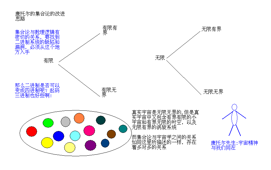 二进制电子数字计算机的数学原理是建立在数理逻辑学基础上的,而数理逻辑是建立在康托尔的集合论基础上面的,但是康托尔的集合论在无限中又包含无限的这个哲学概念上面好像有一点点模糊的地方,所以我思考了一下,画了一个图,希望大家讨论一下