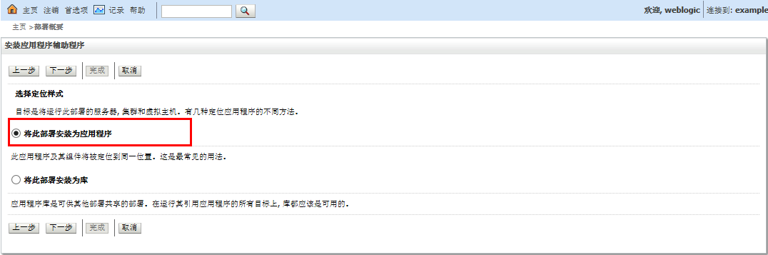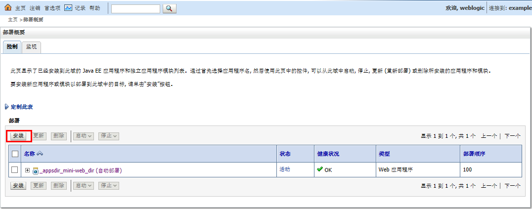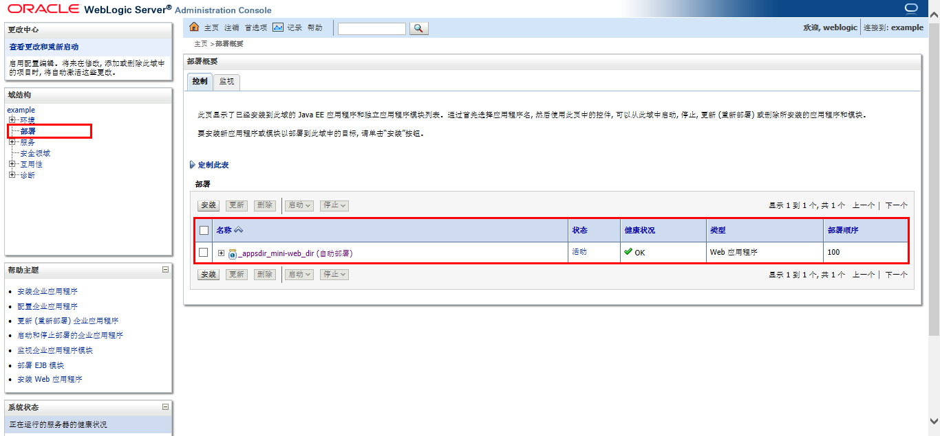 第二步:登录domain的控制台,点击“域结构”-》“部署”,可看到如下界面: