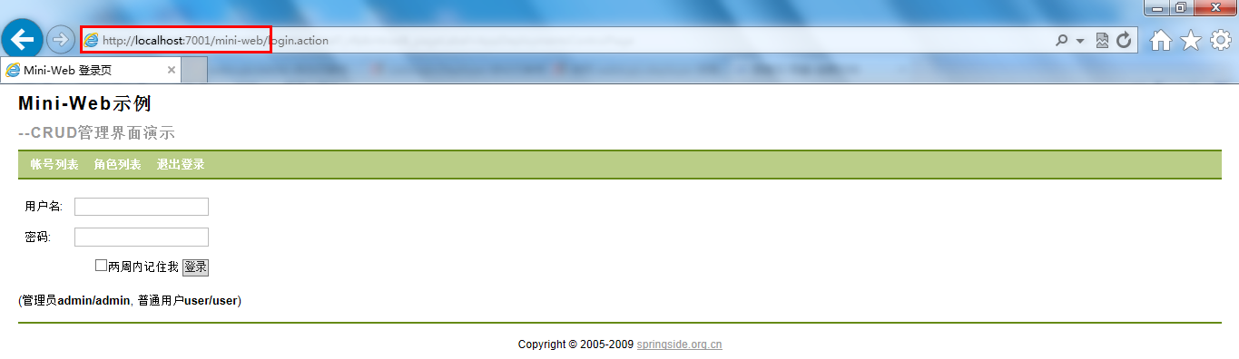 1、准备springside3的应用(mini-web、mini-service),这里我整理为一个war包,一个web应用的文件夹,放在网盘上,提供下载。