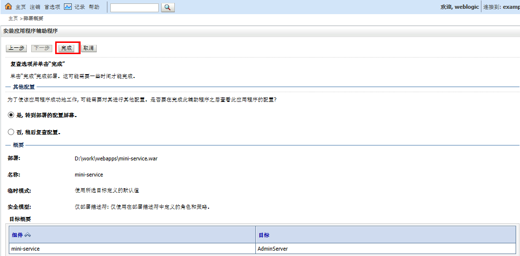点击“完成”按钮之后,实际上domain正在为你的配置加载web应用,此时你可以观察domain的命令控制台(如果部署失败,控制台出现异常信息)。