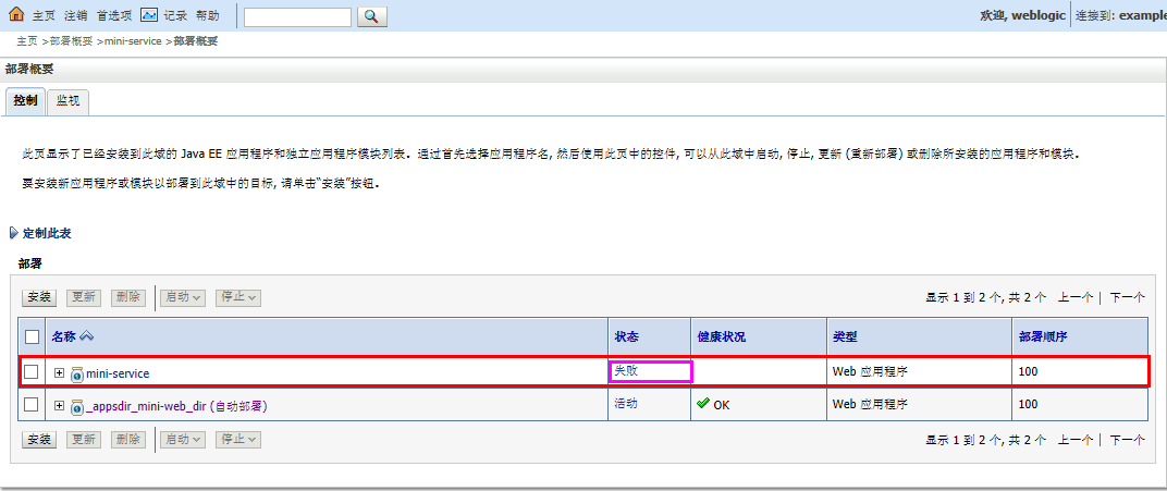 很明显,状态为“失败”。此时你的头脑应该在想,明明在tomcat下可以跑,weblogic这么烂,连个这么简单的应用都部署失败?springside3你怎么连weblogic都不支持?