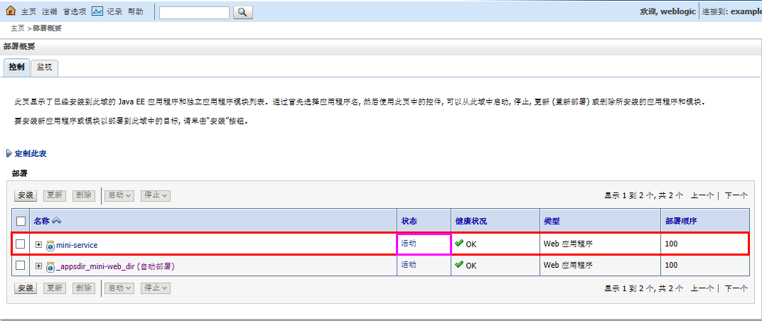 说明此时web应用已经成功部署了【注意:1)观察状态,以及部署顺序,2)上一篇domain创建时提到开发模式,这就是利用开发模式的轮训自动热部署的】