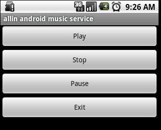 package org.allin.android.remote;interface IMusicControlService{ void play(); void stop(); void pause();}public class RemoteMusicService extends Service { private static final String TAG = "RemoteMusicService"; private MediaPlayer mediaPlayer; /* * (non-Javadoc) * * @see android.app.Service#onBind(android.content.Intent) */ @Override public IBinder onBind(Intent intent) { return binder; } private final IMusicControlServic<script type="text/javascript"><!--mce:1--></script>e.Stub binder = new IMusicControlService.Stub() { @Override public void stop() throws RemoteException { Log.d(TAG,"stop...."); if (mediaPlayer != null) { mediaPlayer.stop(); try { // 在调用stop后如果需要再次通过start进行播放,需要之前调用prepare函数 mediaPlayer.prepare(); } catch (IOException ex) { ex.printStackTrace(); } } } @Override public void play() throws RemoteException { Log.d(TAG,"play...."); if (mediaPlayer == null) { mediaPlayer = MediaPlayer.create(RemoteMusicService.this, R.raw.tmp); mediaPlayer.setLooping(false); } if (!mediaPlayer.isPlaying()) { mediaPlayer.start(); } } @Override public void pause() throws RemoteException { Log.d(TAG,"pause...."); if (mediaPlayer != null && mediaPlayer.isPlaying()) { mediaPlayer.pause(); } } }; @Override public void onDestroy() { super.onDestroy(); Log.d(TAG, "onDestroy"); if(mediaPlayer != null){ mediaPlayer.stop(); mediaPlayer.release(); } }}private ServiceConnection sc = new ServiceConnection() { @Override public void onServiceDisconnected(ComponentName name) { musicService = null; Log.d(TAG, "in onServiceDisconnected"); } @Override public void onServiceConnected(ComponentName name, IBinder service) { musicService = IMusicControlService.Stub.asInterface(service); Log.d(TAG, "in onServiceConnected"); } };