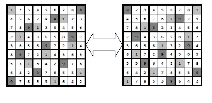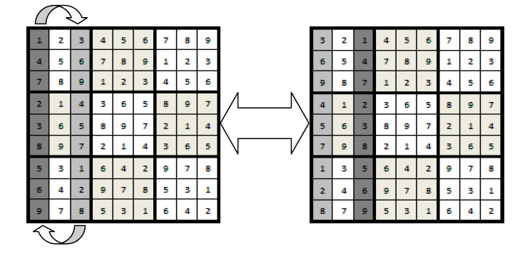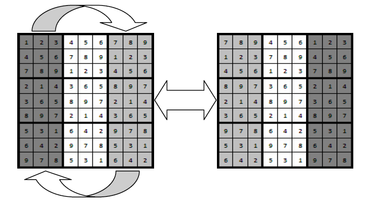 public int[][] generateSudokuArray1() {int randomRowNum = 0;//随机交换20次for (int i = 0; i < 20; i++) {randomRowNum = random.nextInt(8) + 1;for (int col = 0; col < 9; col++) {if(randomRowNum % 3 ==0){int temp = sampleArray[randomRowNum][col];sampleArray[randomRowNum][col] = sampleArray[randomRowNum+1][col];sampleArray[randomRowNum+1][col] = temp;}else{int temp = sampleArray[randomRowNum][col];sampleArray[randomRowNum][col] = sampleArray[randomRowNum-1][col];sampleArray[randomRowNum-1][col] = temp;}}}return sampleArray;}public int[][] generateSudokuArray2() {int randomColumnNum = 0;for (int i = 0; i < 20; i++) {randomColumnNum = random.nextInt(8) + 1;for (int row = 0; row < 9; row++) {if(randomColumnNum %3 ==0){int temp = sampleArray[row][randomColumnNum];sampleArray[row][randomColumnNum] = sampleArray[row][randomColumnNum+1];sampleArray[row][randomColumnNum+1] = temp;}else{int temp = sampleArray[row][randomColumnNum];sampleArray[row][randomColumnNum] = sampleArray[row][randomColumnNum-1];sampleArray[row][randomColumnNum-1] = temp;}}}return sampleArray;}