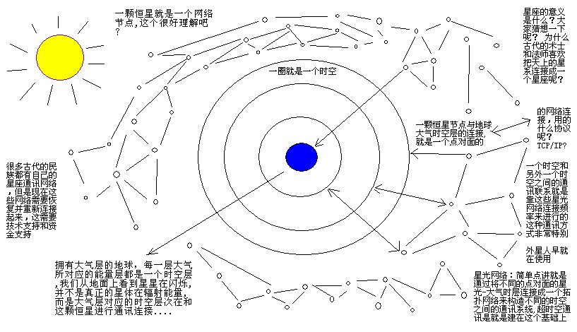 所以,我这里推出一个概念性的网络:星光网络(全称应该是:用恒星(行星)辐射能量与地球大气时空层的通讯连接来进行不同时空间通讯的一种方法)