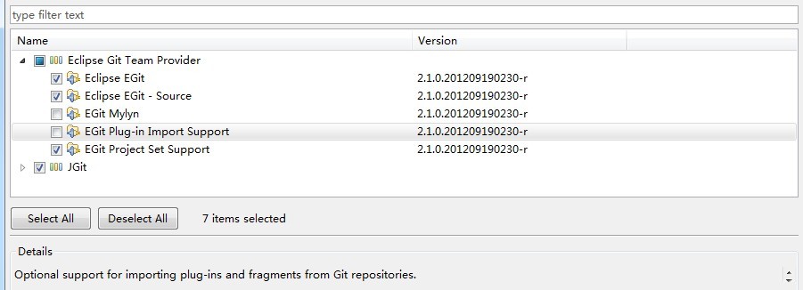 注:在选择安装插件组件时,不需选择EGIT Mylyn , EGIT Plyg-in Import Support两项,如下图:
