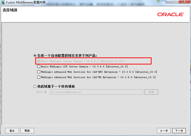 上图所示,默认选中“Basic Weblogic Server Domain……”,即创建基本的域。点击“下一步”