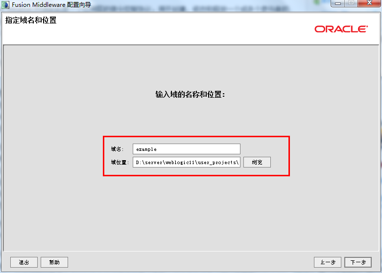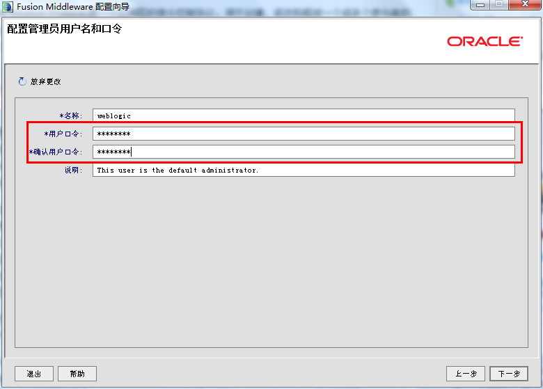 上图所示,默认的账号为weblogic,口令长度有8位限制。输入口令后点击下一步。