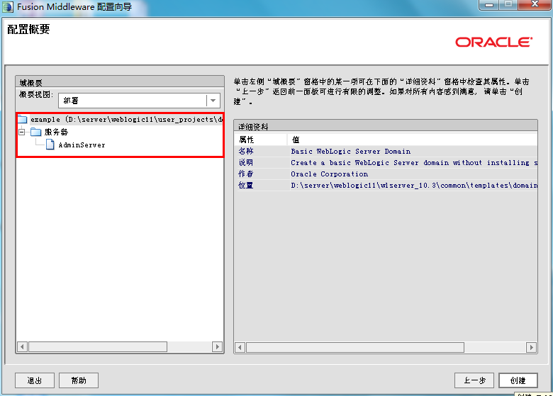 至此,已经完成了基本的配置,上图显示配置的概要信息,如域名、域类型、管理服务器名称等。点击“创建”按钮,进行domain的创建。