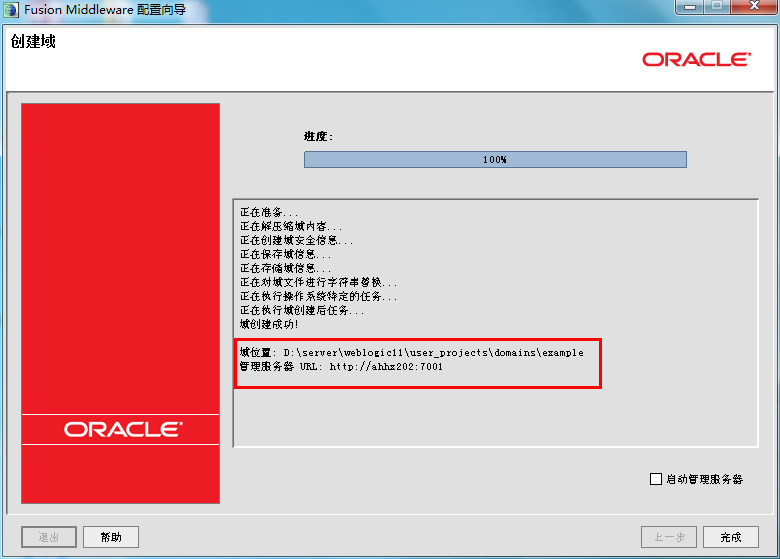 回到安装程序中,可以选中点击“启动管理服务器”立即启动服务器。或者点击“完成”退出安装向导界面(后面如果启动服务器,到域目录下双击“startWebLogic.cmd”即可。
