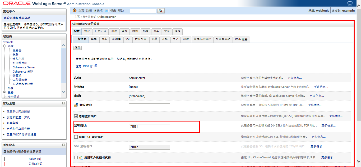 如上图所示,点击“环境”-》“服务器”,可看到主页面显示“服务器概要”界面。这里的AdminServer即默认的管理服务器。(如果是非集群环境,可以直接把应用部署到这里,集群环境,AdminServer仅作为管理其它server的服务器使用)。注意这里的状态、端口。点击“AdminServer”的链接,出现配置AdminServer的界面,如下图所示: