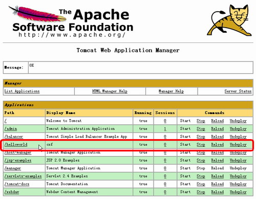 然后在 Windows 下通过 startup.bat 或在 Unix 下通过 startup.sh 来启动 Tomcat,CXF 的应用也就随之启动。通过 Tomcat 管理控制台 http://localhost:8080/manager/html/ 可以看到已经成功部署了 helloworld.war 的应用程序,如下图所示: