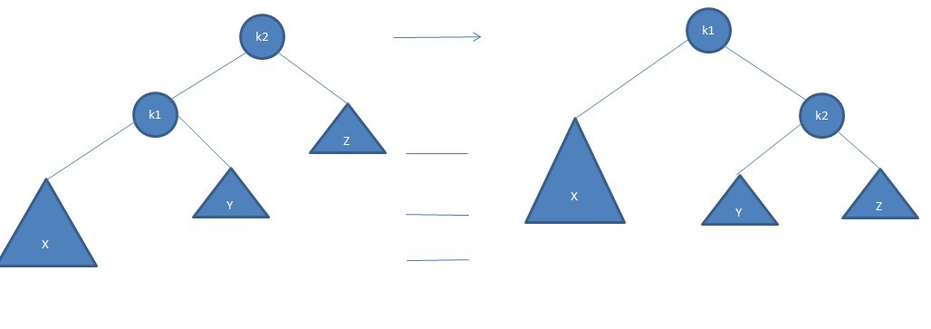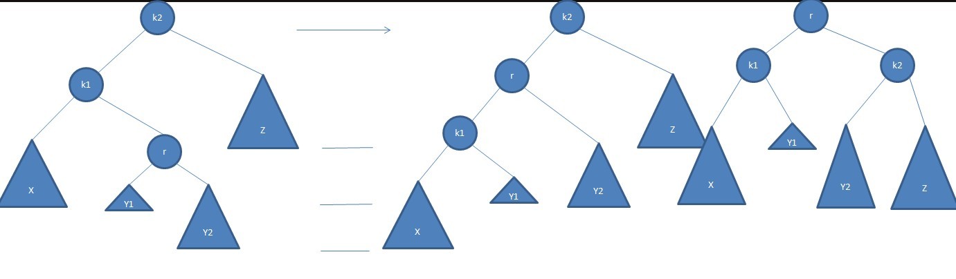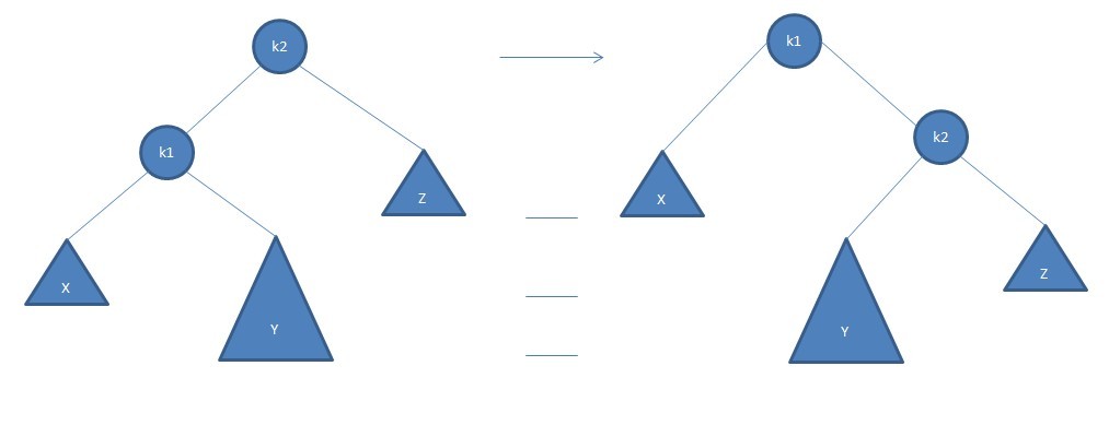 由图1可以看出,当插入到子树X中时,导致k2的左子树比右子树的高度高2,导致不平衡,需要进行旋转,将k1和k2进行旋转,然后把k1的子树Y挂接为k2的左子树,可以看出,在这种情况下,只需要进行一次旋转就行了。