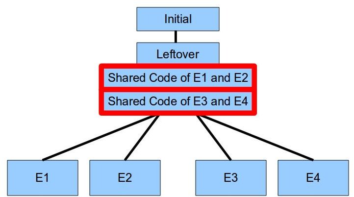 如图所示,GWT编译器为每一个小块创建一个独有的片段并且添加任何共享代码到剩下的片段中,这样做会导致随着开发者添加越来越多的小块时,剩下的片段会变得越来越大,从而导致第一次请求的延迟。