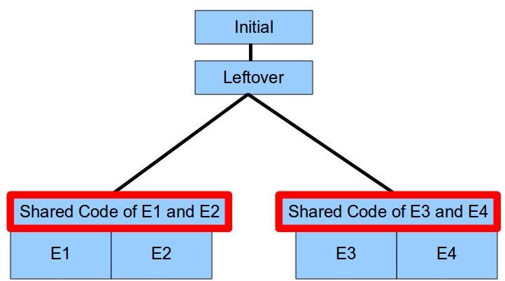 这副图片展示了GWT编译器意识到E1和E2两个小块共享了足够多的代码然后自动将他们合并成为一个片段,有效地减少了余下片段中共享代码的大小。如果应用程序需要E1或者E2,那么浏览器是下载他们绑定后的片段。这样做不仅仅减少了余下片段的大小,而且还减少了HTTP请求的次数,假使最终需要很多片段。
