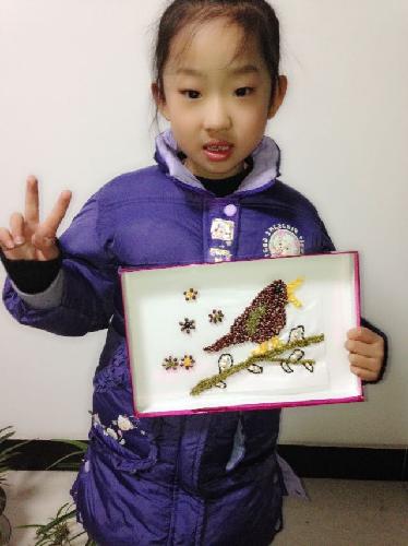 妈妈给我准备了胶水、牙签、摄子,然后我用红豆贴出鸟儿的身体,用黄色的小米贴出鸟儿的嘴巴和爪子······没多大功夫,我就贴出美丽的小鸟站在枝头在唱歌。看着自己的劳动成果,虽然有点累,但我心里美滋滋的。