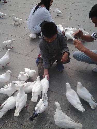 我买了包杂粮,开始了我从未有过的喂鸽之旅。把杂粮撒在地上,它们争而食之。忽然有一种与鸽子更亲密接触的念头,我把杂粮倒入手中,“咕咕,咕咕”地叫鸽子。小东西真通人性,大步流星地跑到我面前,毫不客气地在我手里啄食起来。“哎哟,痒啊,好痒!”当鸽子用它红色的倒三角形的嘴喙啄食我手里的杂粮时,一股痒酥酥的感觉传遍全身。我乐在其中,醉在其中!