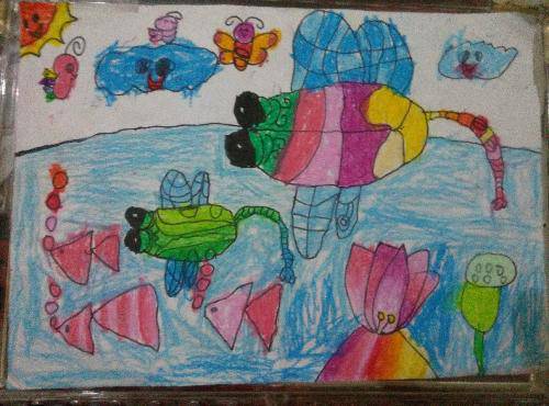 我画的蜻蜓在大海的中间快活的飞来飞去,看起来好好玩,就像是一个大大的水乐园一样。我的画上还有蝴蝶、白云、太阳,大河里有三条快活的小鱼在游来游去。荷花是很漂亮的荷花,莲蓬是很漂亮的莲蓬。我画的荷花是用渐变色画的,简直好漂亮,好好看。我画的太阳是用两种颜色组成的,一种是黄色,一种是红色。鱼儿和蜻蜓都是渐变色。