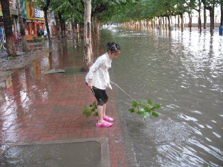 雷雨过后,妈妈带我去外面逛一逛,大门口的雨水没过我的脚踝,大街上已没有下脚的地方,路中间的汽车变成了海洋里的小船。一艘小船开过来,溅起高高的浪花,推起一层层波澜,像海水涨潮一样向我涌来,它穿过人行道,“砰”的一下,浪花打湿了我的马裤,我尖叫着跳起来。