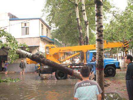 顺着路边看去,地上落满翠绿的枝叶,看起来很新鲜。忽然发现前面有好多人,好像发生了什么事情,我和妈妈赶过去,看到一棵大树被连根拔起,正好倒在房顶上。消防车来了看了看没有消防事故就离开了,照明抢险车来了也看了看,可能是电线也没问题就开走了。后来,来了辆拉树枝的卡车,看了看也走了,可能是树太大拉不动吧。最后,来了辆大吊车,妈妈说是市政管理的工作人员,管理员们在大吊车的帮助下开始锯掉大大的树枝,努力的清理这棵可怜的大树,我多么希望这个大树能像原来一样站在那里呀。