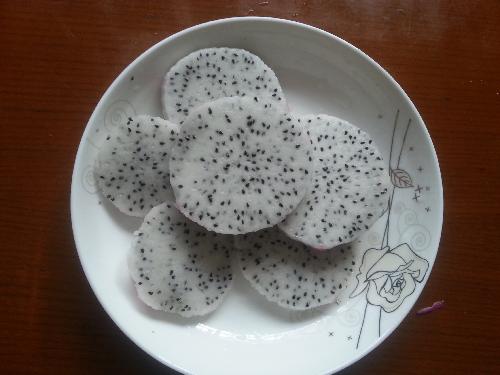 老师将火龙果拦腰切开,我们都惊讶的目瞪口呆,最外面是一圈红红的内皮,紧挨着内皮是白白嫩嫩的果肉,果肉里撒满了黑芝麻一样的种子。红、白、黑相间,像一幅水墨画,十分诱人。