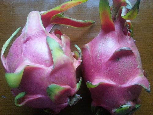 在所有水果中,火龙果很奇特,皮火红火红的,上面的叶子翠绿翠绿的,看上去像一团火焰。还像一个橄榄球,也像一条红色的金龟,更像一条火龙。绿色的叶子像鱼鳞,也像火苗,如果仔细观察,会发现底部有一枚硬币大小的黑洞,像火山口。