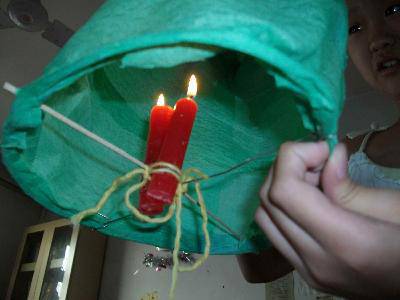 第三,用一根薄而窄的竹条,弯成与下面圆口一样大小的竹圈,在竹圈内交叉两根互相垂直的细铁丝,并系牢,然后把竹圈粘在下面圆口的纸边上。再把两根蜡烛扎在铁丝中心,孔明灯就做好了。