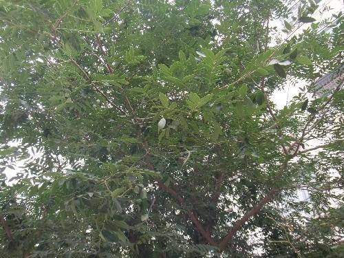 但不同的是,这棵树每年的春天早早的就发芽了,而且,枝干间的一团一团的、尖尖的刺也随着不断的增多;并且它的生长速度特别快,夏天到来的时候,它已经枝叶茂密了,工人叔叔在树下安装了健身器材和桌椅,供人们健身和乘凉用;随着夏天不断的接近尾声,这棵树竟不知不觉的长出了像豌豆角一样的果实,慢慢的,这些果实越长越大,长的达到了15厘米左右,即便是短的也在7、8厘米左右;秋天到了,树叶一片一片的掉落下来,这些果实也由绿色变成了黑紫色。这到底是一棵什么树呢?它的果实又有什么用呢?