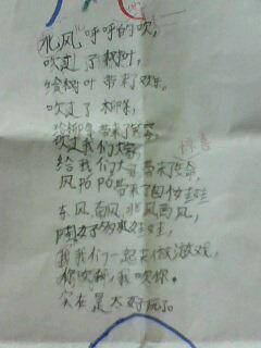 孩子是可爱的,为了保护孩子这可爱的热情,今天上午,我把范家伟叫到办公室,打开我的博文让孩子看。孩子看到他的诗在老师的博文中发表,笑得合不拢嘴。下午,孩子到我跟前自豪地说:“老师,我又写了一首诗。”我一看题目,从心里笑了,小家伙还真想当诗人,挺会从生活中找题材。星期一和星期二这两天,风大,孩子就以《风》为题,写了这首小诗充满童真童趣的快乐诗歌。