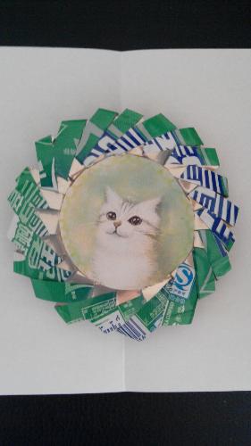 我做的小相框是圆形的,周围亮闪闪的,同学们都说我做的是“照妖镜”。不过,因为我找了一个小猫的图片镶在了相框的中间,所以任何妖精在我的镜子面前一照,都是猫变的。嘻嘻!~~