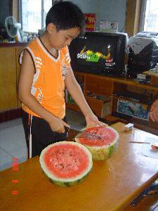 1、先挑选一个大西瓜(这可是舅舅送给我的大西瓜),再把西瓜一分为二;
