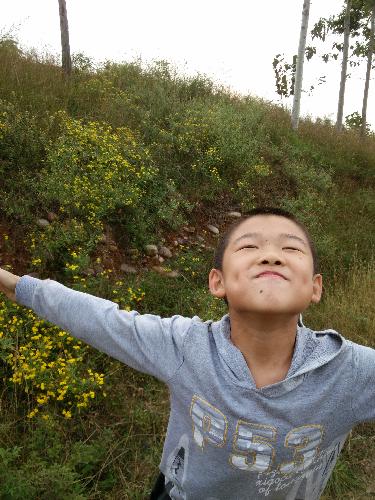 我们骑车沿公路缓缓而上。走近北郊,野外美景展现在眼前。平坦的荒野、小山坡上,道路两旁,覆盖着野草,绿色和黄色交织着,铺满原野。最深的地方可以没过十来岁的孩子,能让他们在里面捉迷藏。草丛中开满了各种各样的野花,五颜六色的,尤其是野菊花,一大片,一大片的,更是绚丽夺目。一阵风吹来,送来原野清新的芬芳,令人神清气爽,我不觉唱起了儿童歌曲“牧笛声声” :