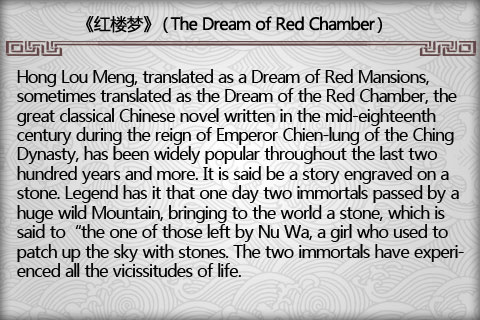 Hong Lou Meng, translated as a Dream of Red Mansions, sometimes translated as the Dream of the Red Chamber, the great classical Chinese novel written in the mid- eighteenth century during the reign of Emperor Chien-lung of the Ching Dynasty, has been widely popular throughout the last two hundred years and more. It is said be a story engraved on a stone. Legend has it that one day two immortals passed by a huge wild Mountain, bringing to the world a stone, which is said to “the one of those left by Nu Wa, a girl who used to patch up the sky with stones. The two immortals have experienced all the vicissitudes of life. This chapter is the seventh-- You can choose the following three modes to read the wonderful comic : gradient、page turning、continuous . What's new Screenshots