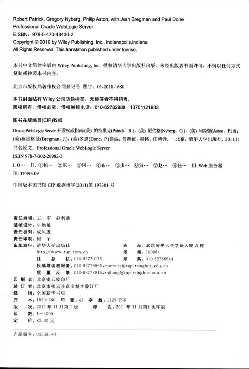 《Oracle WebLogic Server开发权威指南》:介绍了选择Java EEI应用程序体系结构的技巧全面讲解了多种设计方案、体系结构、构建技术、部署选项和管理技术提供了一个真实的示例,涵盖了JSP、Spring MVC、EJB 3.0、JPA和JAN.WS等关键技术详细分析了在开发和部署示例应用程序时所做决策的方方面面展示了开发环境和生产环境的配置、管理和调优的最佳实践,探讨了WebLogic Server JWS和WebLogic安全性。